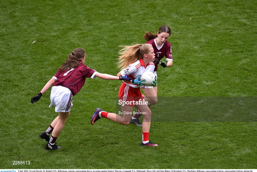 9 July 2022; Neveah Dowds, St. Brigid's P.S., Ballymena, Antrim, representing Derry, in action against Saoirse Murray, Craggagh N.S., Kiltimagh, Mayo, left, and Sian Bolger, St Brendans N.S., Muckalee, Kilkenny, representing Galway, representing Galway, during the INTO Cumann na mBunscol GAA Respect Exhibition Go Games before the GAA Football All-Ireland Senior Championship Semi-Final match between Galway and Derry at Croke Park in Dublin. Photo by Daire Brennan/Sportsfile