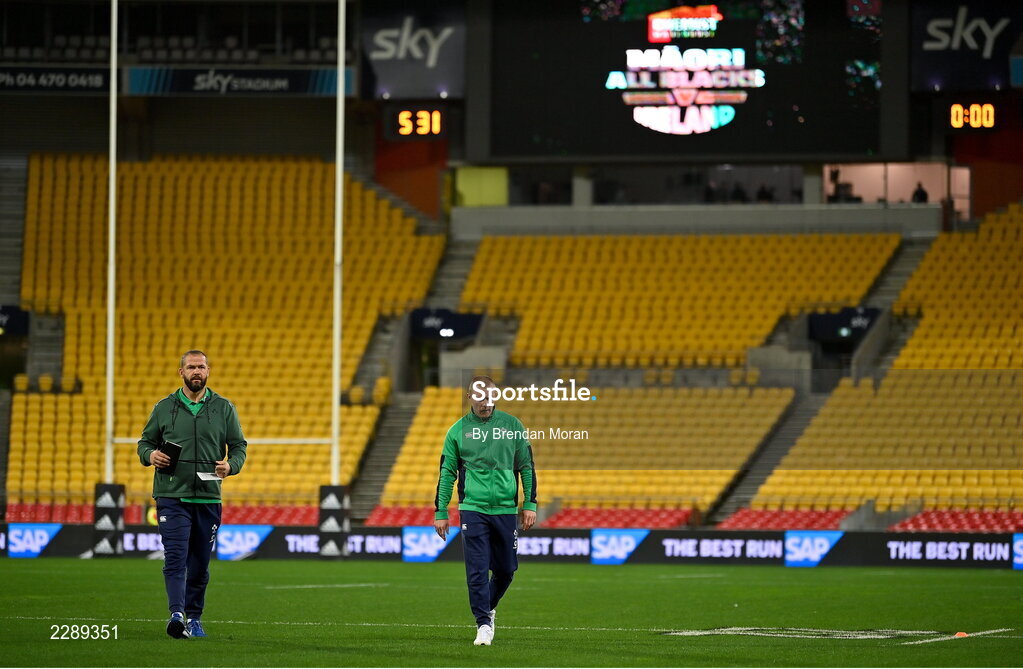 12 July 2022; Ireland head coach Andy Farrell, left, and captain Keith Earls walk the pitch before the match between the Maori All Blacks and Ireland at the Sky Stadium in Wellington, New Zealand. Photo by Brendan Moran/Sportsfile