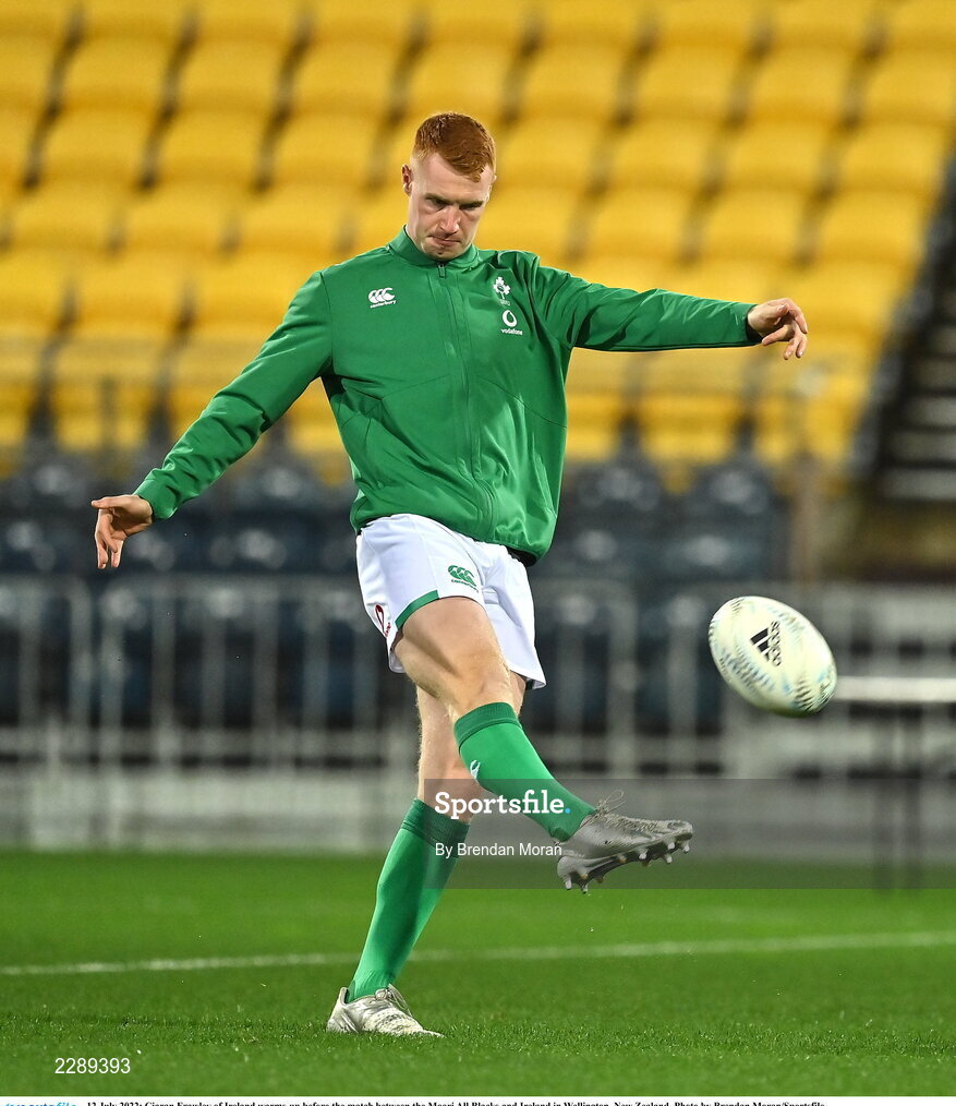 12 July 2022; Ciaran Frawley of Ireland warms-up before the match between the Maori All Blacks and Ireland in Wellington, New Zealand. Photo by Brendan Moran/Sportsfile