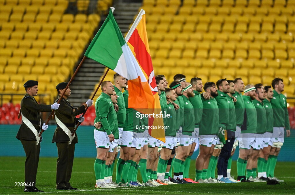 12 July 2022; Ireland captain Keith Earls leads his side in the line-up during the playing of Ireland's Call before the match between the Maori All Blacks and Ireland at the Sky Stadium in Wellington, New Zealand. Photo by Brendan Moran/Sportsfile