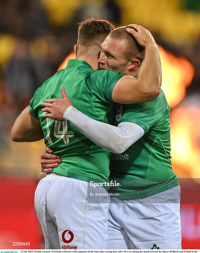12 July 2022; Jordan Larmour of Ireland celebrates with teammate Keith Earls after scoring their side's first try during the match between the Maori All Blacks and Ireland at the Sky Stadium in Wellington, New Zealand. Photo by Brendan Moran/Sportsfile