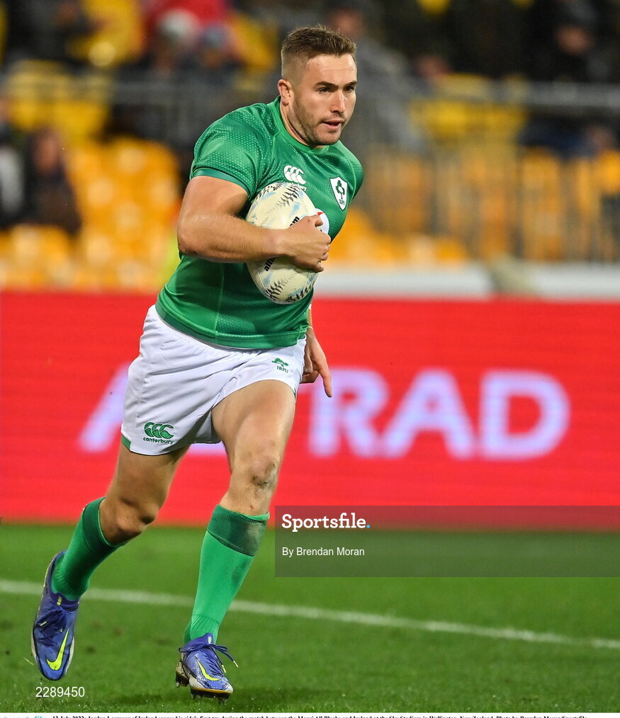 12 July 2022; Jordan Larmour of Ireland scores his side's first try during the match between the Maori All Blacks and Ireland at the Sky Stadium in Wellington, New Zealand. Photo by Brendan Moran/Sportsfile