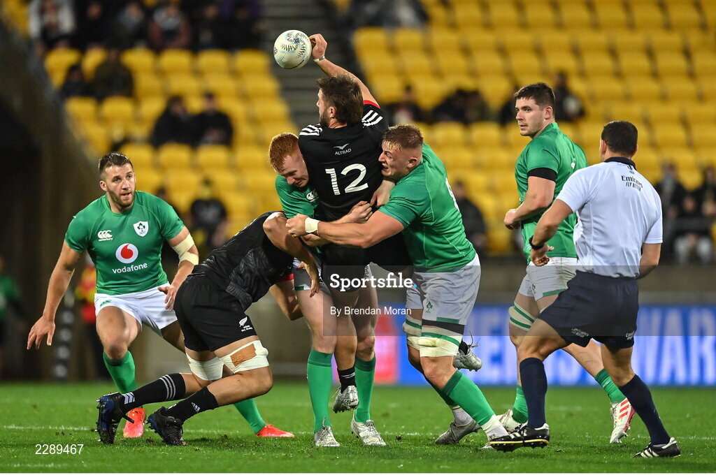 12 July 2022; Alex Nankivell of Maori All Blacks is tackled by Ciaran Frawley, left, and Gavin Coombes of Ireland during the match between the Maori All Blacks and Ireland at the Sky Stadium in Wellington, New Zealand. Photo by Brendan Moran/Sportsfile