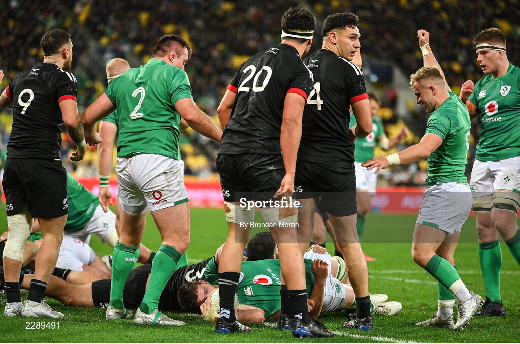 12 July 2022; Craig Casey of Ireland, right, celebrates after teammate Nick Timoney scores their side's second try during the match between the Maori All Blacks and Ireland at the Sky Stadium in Wellington, New Zealand. Photo by Brendan Moran/Sportsfile
