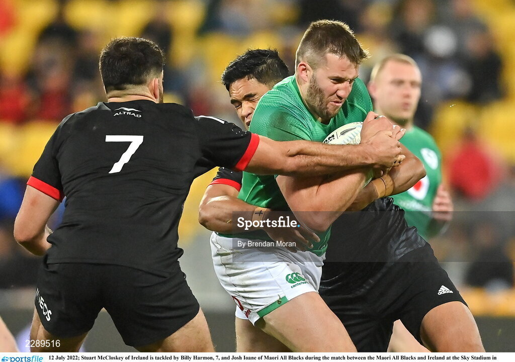 12 July 2022; Stuart McCloskey of Ireland is tackled by Billy Harmon, 7, and Josh Ioane of Maori All Blacks during the match between the Maori All Blacks and Ireland at the Sky Stadium in Wellington, New Zealand. Photo by Brendan Moran/Sportsfile
