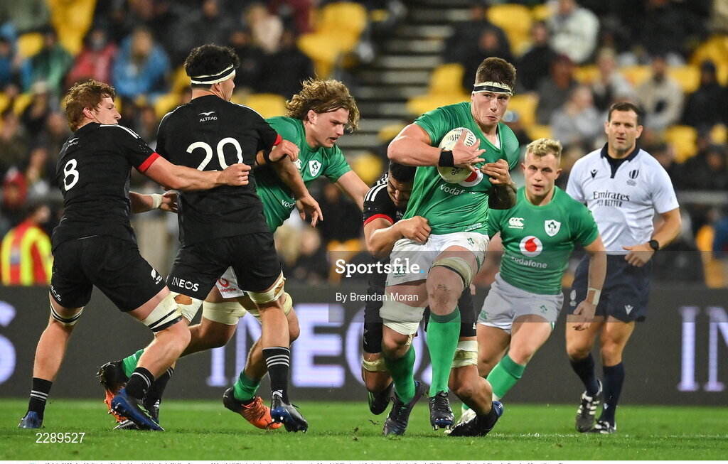 12 July 2022; Joe McCarthy of Ireland is tackled by Isaia Walker-Leawere of Maori All Blacks during the match between the Maori All Blacks and Ireland at the Sky Stadium in Wellington, New Zealand. Photo by Brendan Moran/Sportsfile