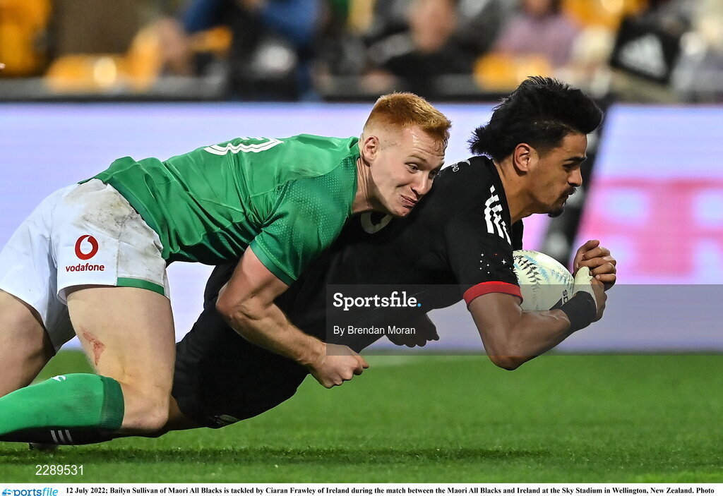 12 July 2022; Bailyn Sullivan of Maori All Blacks is tackled by Ciaran Frawley of Ireland during the match between the Maori All Blacks and Ireland at the Sky Stadium in Wellington, New Zealand. Photo by Brendan Moran/Sportsfile