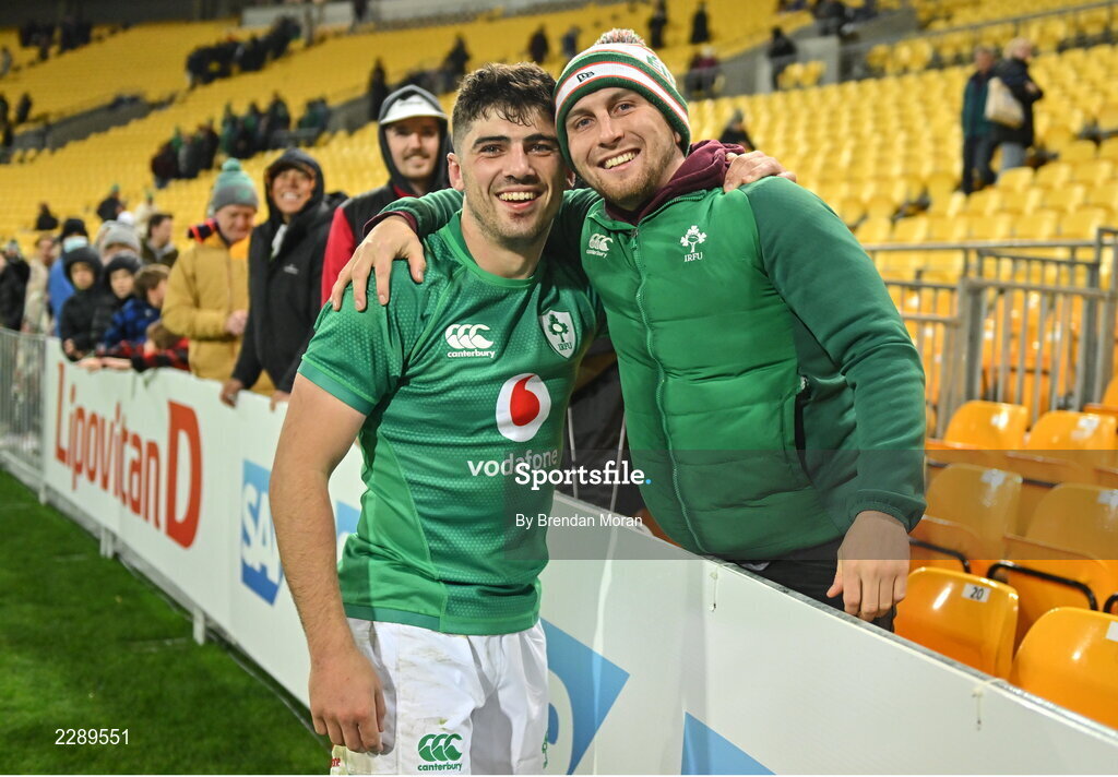 12 July 2022; Jimmy O’Brien of Ireland celebrates with his friend, Niall Delahunt, from Kildare, after the match between the Maori All Blacks and Ireland at the Sky Stadium in Wellington, New Zealand. Photo by Brendan Moran/Sportsfile