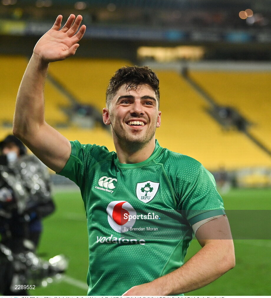 12 July 2022; Jimmy O’Brien of Ireland celebrates after the match between the Maori All Blacks and Ireland at the Sky Stadium in Wellington, New Zealand. Photo by Brendan Moran/Sportsfile