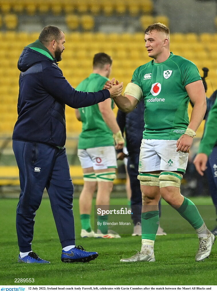 12 July 2022; Ireland head coach Andy Farrell, left, celebrates with Gavin Coombes after the match between the Maori All Blacks and Ireland at the Sky Stadium in Wellington, New Zealand. Photo by Brendan Moran/Sportsfile