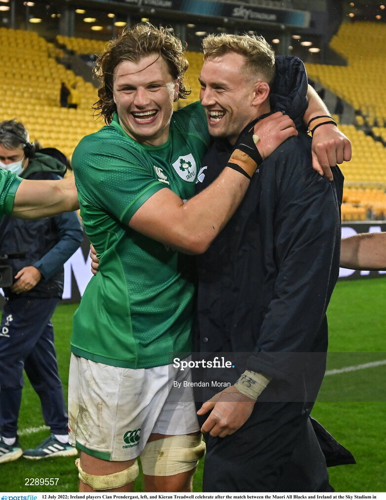 12 July 2022; Ireland players Cian Prendergast, left, and Kieran Treadwell celebrate after the match between the Maori All Blacks and Ireland at the Sky Stadium in Wellington, New Zealand. Photo by Brendan Moran/Sportsfile