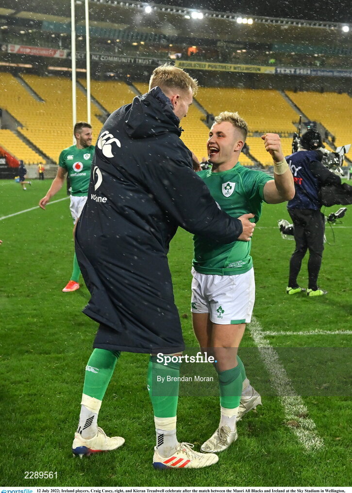 12 July 2022; Ireland players, Craig Casey, right, and Kieran Treadwell celebrate after the match between the Maori All Blacks and Ireland at the Sky Stadium in Wellington, New Zealand. Photo by Brendan Moran/Sportsfile
