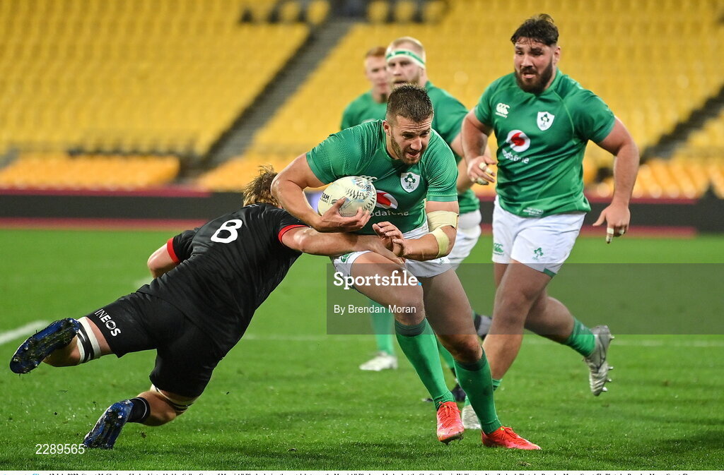 12 July 2022; Stuart McCloskey of Ireland is tackled by Cullen Grace of Maori All Blacks during the match between the Maori All Blacks and Ireland at the Sky Stadium in Wellington, New Zealand. Photo by Brendan Moran/Sportsfile Photo by Brendan Moran/Sportsfile