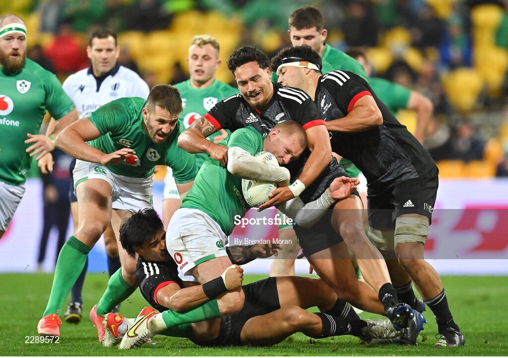 12 July 2022; Keith Earls of Ireland is tackled by Billy Proctor and Bailyn Sullivan of Maori All Blacks during the match between the Maori All Blacks and Ireland at the Sky Stadium in Wellington, New Zealand. Photo by Brendan Moran/Sportsfile