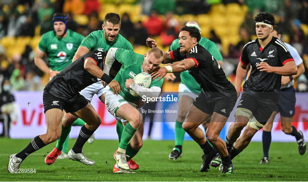12 July 2022; Keith Earls of Ireland is tackled by Billy Proctor and Bailyn Sullivan of Maori All Blacks during the match between the Maori All Blacks and Ireland at the Sky Stadium in Wellington, New Zealand. Photo by Brendan Moran/Sportsfile