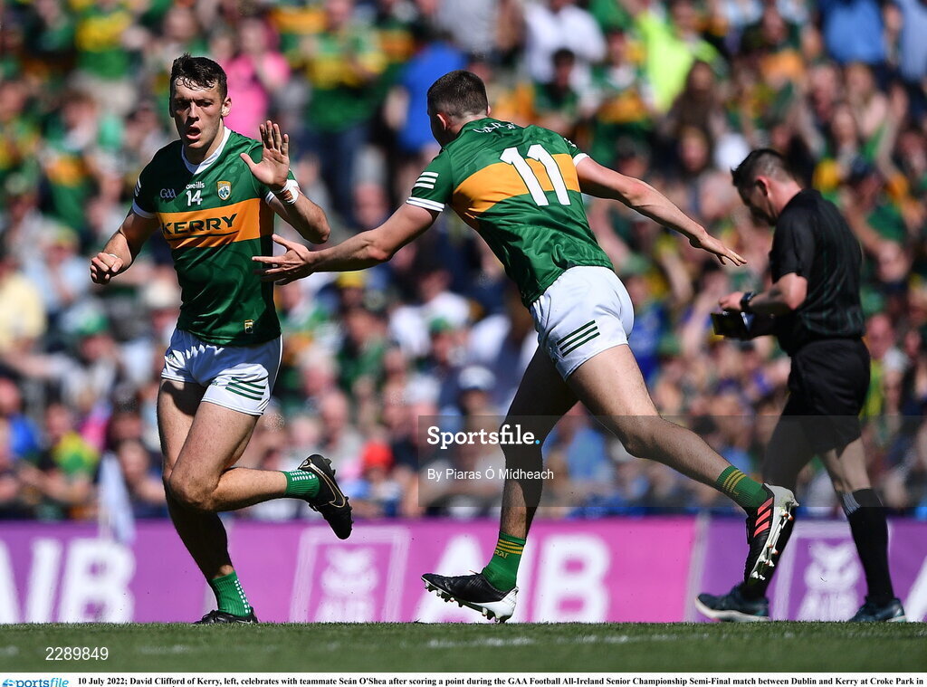 10 July 2022; David Clifford of Kerry, left, celebrates with teammate Seán O'Shea after scoring a point during the GAA Football All-Ireland Senior Championship Semi-Final match between Dublin and Kerry at Croke Park in Dublin. Photo by Piaras Ó Mídheach/Sportsfile