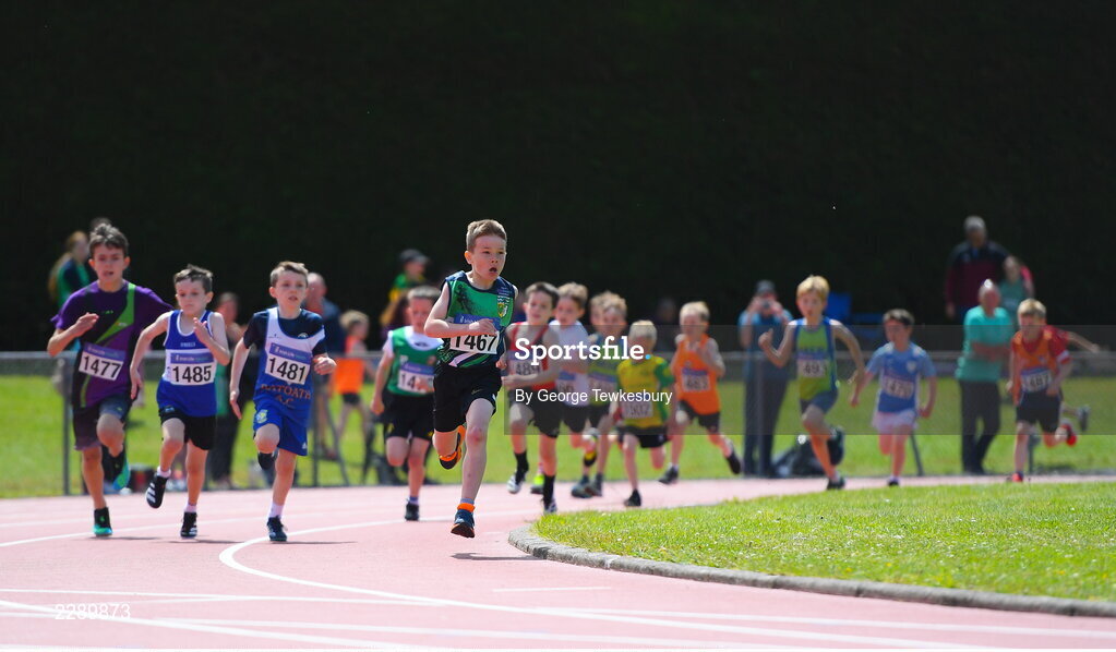 2 July 2022; Garvan Curran of Castlerea Crusaders A.C., 1467, leads the Boy's U9's 300m during the Irish Life Health Children’s Team Games & U12/U13 Championships in Tullamore, Offaly. Photo by George Tewkesbury/Sportsfile
