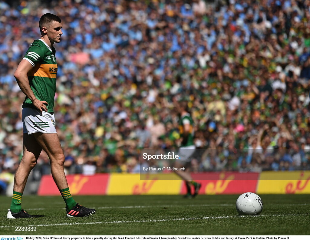 10 July 2022; Seán O'Shea of Kerry prepares to take a penalty during the GAA Football All-Ireland Senior Championship Semi-Final match between Dublin and Kerry at Croke Park in Dublin. Photo by Piaras Ó Mídheach/Sportsfile