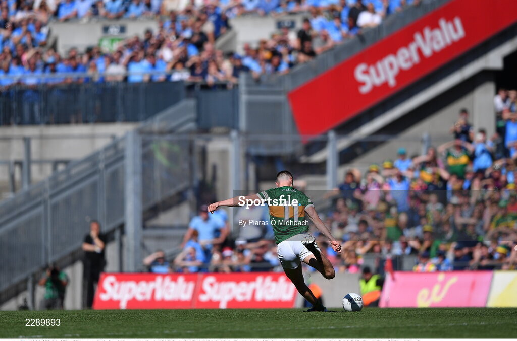 10 July 2022; Seán O'Shea of Kerry scores the winning point from an injury time free kick during the GAA Football All-Ireland Senior Championship Semi-Final match between Dublin and Kerry at Croke Park in Dublin. Photo by Piaras Ó Mídheach/Sportsfile