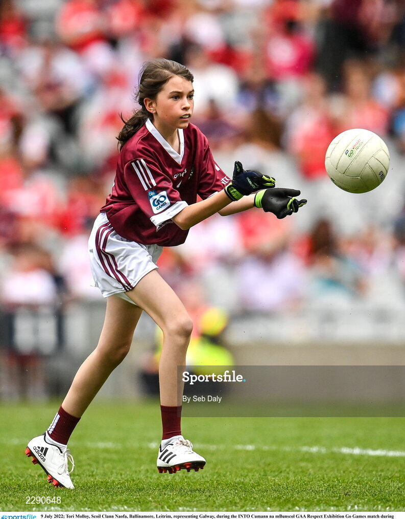 9 July 2022; Tori Molloy, Scoil Clann Naofa, Ballinamore, Leitrim, representing Galway, during the INTO Cumann na mBunscol GAA Respect Exhibition Go Games match during half-time of the GAA Football All-Ireland Senior Championship Semi-Final match between Galway and Derry at Croke Park in Dublin. Photo by Seb Daly/Sportsfile