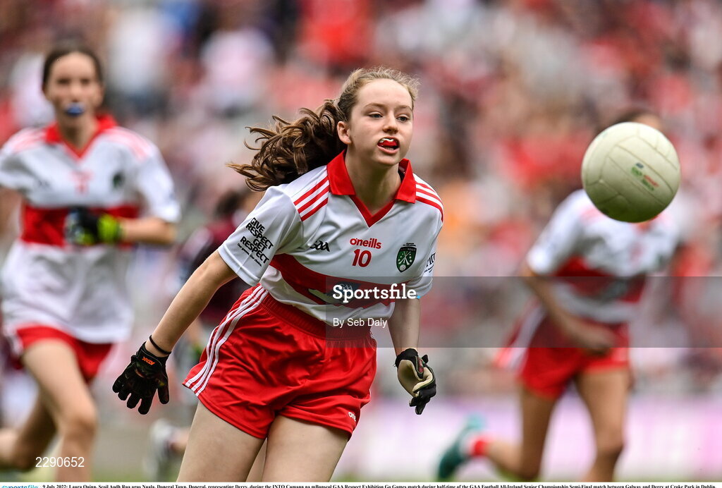 9 July 2022; Laura Quinn, Scoil Aodh Rua agus Nuala, Donegal Town, Donegal, representing Derry, during the INTO Cumann na mBunscol GAA Respect Exhibition Go Games match during half-time of the GAA Football All-Ireland Senior Championship Semi-Final match between Galway and Derry at Croke Park in Dublin. Photo by Seb Daly/Sportsfile