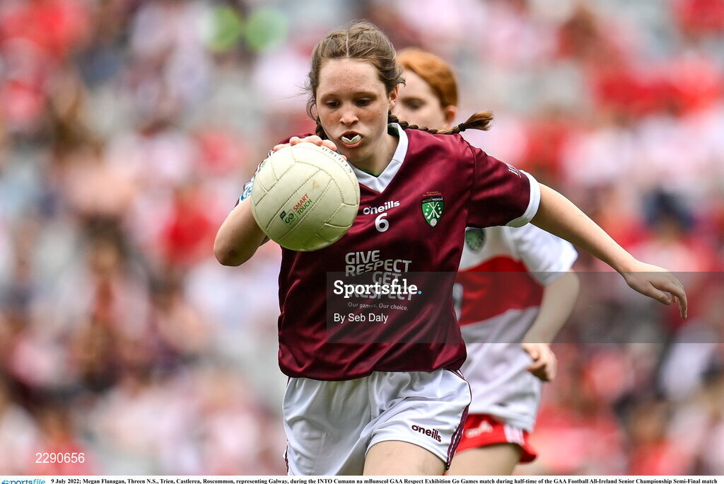 9 July 2022; Megan Flanagan, Threen N.S., Trien, Castlerea, Roscommon, representing Galway, during the INTO Cumann na mBunscol GAA Respect Exhibition Go Games match during half-time of the GAA Football All-Ireland Senior Championship Semi-Final match between Galway and Derry at Croke Park in Dublin. Photo by Seb Daly/Sportsfile