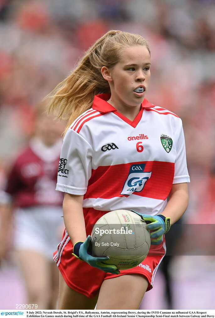 9 July 2022; Neveah Dowds, St. Brigid's P.S., Ballymena, Antrim, representing Derry, during the INTO Cumann na mBunscol GAA Respect Exhibition Go Games match during half-time of the GAA Football All-Ireland Senior Championship Semi-Final match between Galway and Derry at Croke Park in Dublin. Photo by Seb Daly/Sportsfile