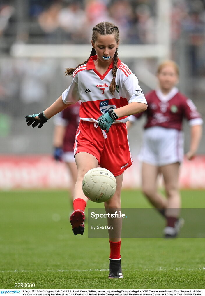 9 July 2022; Mia Gallagher, Holy Child P.S., South Green, Belfast, Antrim, representing Derry, during the INTO Cumann na mBunscol GAA Respect Exhibition Go Games match during half-time of the GAA Football All-Ireland Senior Championship Semi-Final match between Galway and Derry at Croke Park in Dublin. Photo by Seb Daly/Sportsfile