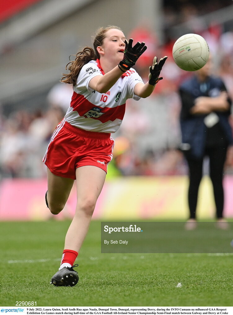 9 July 2022; Laura Quinn, Scoil Aodh Rua agus Nuala, Donegal Town, Donegal, representing Derry, during the INTO Cumann na mBunscol GAA Respect Exhibition Go Games match during half-time of the GAA Football All-Ireland Senior Championship Semi-Final match between Galway and Derry at Croke Park in Dublin. Photo by Seb Daly/Sportsfile
