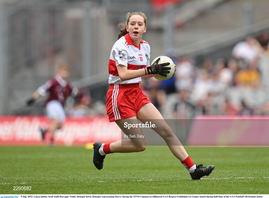 9 July 2022; Laura Quinn, Scoil Aodh Rua agus Nuala, Donegal Town, Donegal, representing Derry, during the INTO Cumann na mBunscol GAA Respect Exhibition Go Games match during half-time of the GAA Football All-Ireland Senior Championship Semi-Final match between Galway and Derry at Croke Park in Dublin. Photo by Seb Daly/Sportsfile