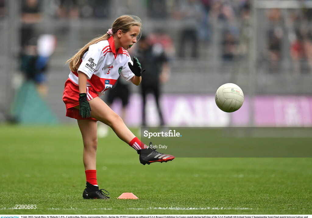 9 July 2022; Sarah Rice, St Malachy’s P.S., Castlewellan, Down, representing Derry, during the INTO Cumann na mBunscol GAA Respect Exhibition Go Games match during half-time of the GAA Football All-Ireland Senior Championship Semi-Final match between Galway and Derry at Croke Park in Dublin. Photo by Seb Daly/Sportsfile