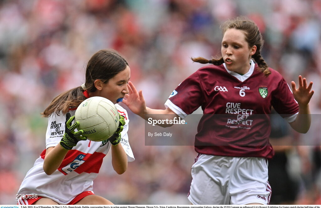 9 July 2022; Eva O'Donoghue, St Mary's N.S., Donnybrook, Dublin, representing Derry, in action against Megan Flanagan, Threen N.S., Trien, Castlerea, Roscommon, representing Galway, during the INTO Cumann na mBunscol GAA Respect Exhibition Go Games match during half-time of the GAA Football All-Ireland Senior Championship Semi-Final match between Galway and Derry at Croke Park in Dublin. Photo by Seb Daly/Sportsfile