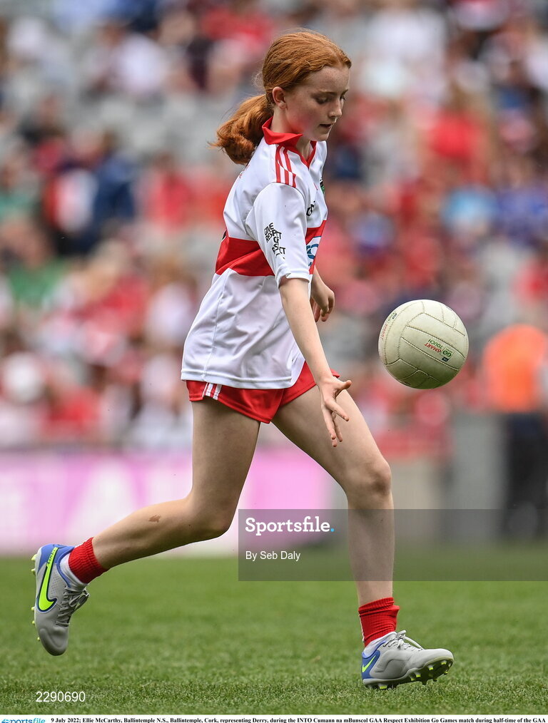 9 July 2022; Ellie McCarthy, Ballintemple N.S., Ballintemple, Cork, representing Derry, during the INTO Cumann na mBunscol GAA Respect Exhibition Go Games match during half-time of the GAA Football All-Ireland Senior Championship Semi-Final match between Galway and Derry at Croke Park in Dublin. Photo by Seb Daly/Sportsfile
