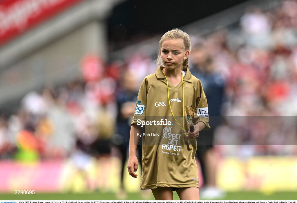 9 July 2022; Referee Jenny Lennon, St. Mary’s P.S., Rathfriland, Down, during the INTO Cumann na mBunscol GAA Respect Exhibition Go Games match during half-time of the GAA Football All-Ireland Senior Championship Semi-Final match between Galway and Derry at Croke Park in Dublin. Photo by Seb Daly/Sportsfile