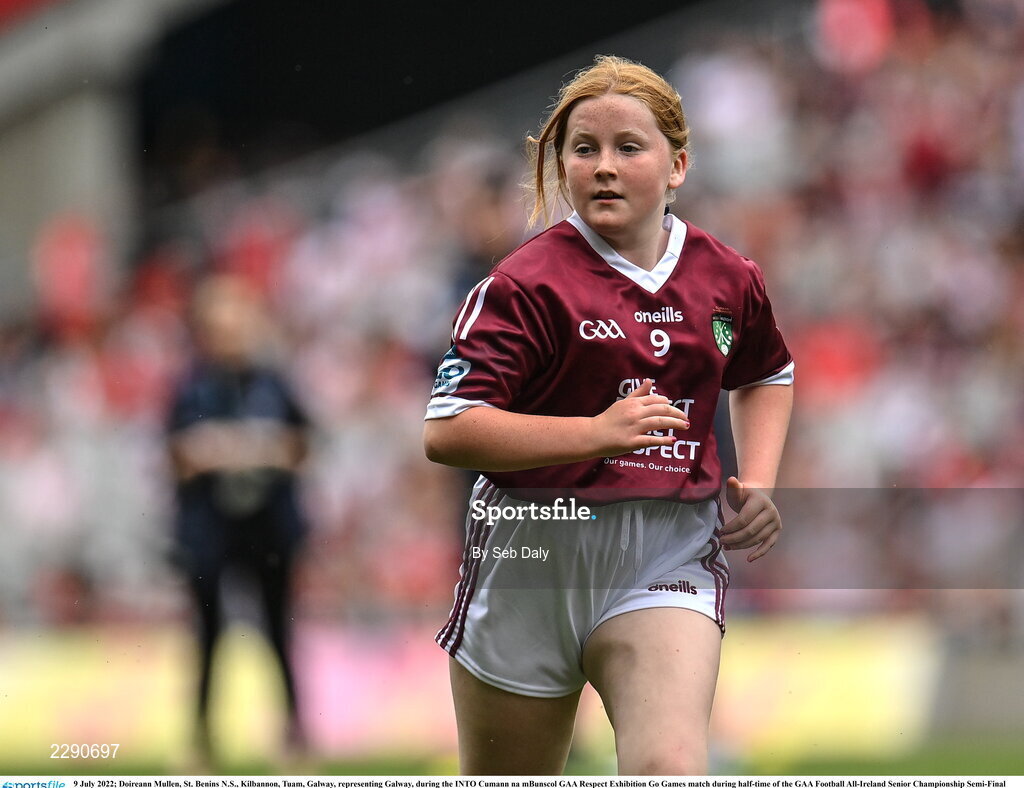 9 July 2022; Doireann Mullen, St. Benins N.S., Kilbannon, Tuam, Galway, representing Galway, during the INTO Cumann na mBunscol GAA Respect Exhibition Go Games match during half-time of the GAA Football All-Ireland Senior Championship Semi-Final match between Galway and Derry at Croke Park in Dublin. Photo by Seb Daly/Sportsfile