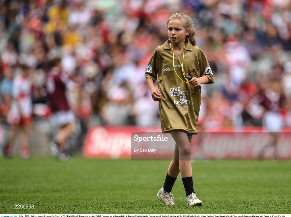 9 July 2022; Referee Jenny Lennon, St. Mary’s P.S., Rathfriland, Down, during the INTO Cumann na mBunscol GAA Respect Exhibition Go Games match during half-time of the GAA Football All-Ireland Senior Championship Semi-Final match between Galway and Derry at Croke Park in Dublin. Photo by Seb Daly/Sportsfile