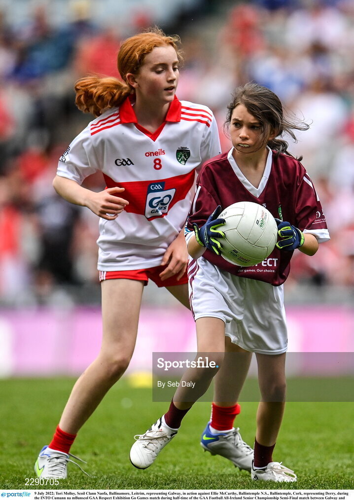 9 July 2022; Tori Molloy, Scoil Clann Naofa, Ballinamore, Leitrim, representing Galway, in action against Ellie McCarthy, Ballintemple N.S., Ballintemple, Cork, representing Derry, during the INTO Cumann na mBunscol GAA Respect Exhibition Go Games match during half-time of the GAA Football All-Ireland Senior Championship Semi-Final match between Galway and Derry at Croke Park in Dublin. Photo by Seb Daly/Sportsfile