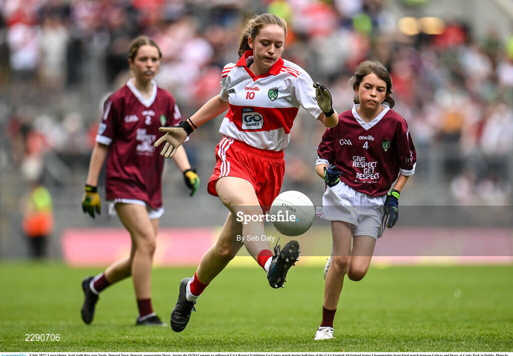 9 July 2022; Laura Quinn, Scoil Aodh Rua agus Nuala, Donegal Town, Donegal, representing Derry, during the INTO Cumann na mBunscol GAA Respect Exhibition Go Games match during half-time of the GAA Football All-Ireland Senior Championship Semi-Final match between Galway and Derry at Croke Park in Dublin. Photo by Seb Daly/Sportsfile