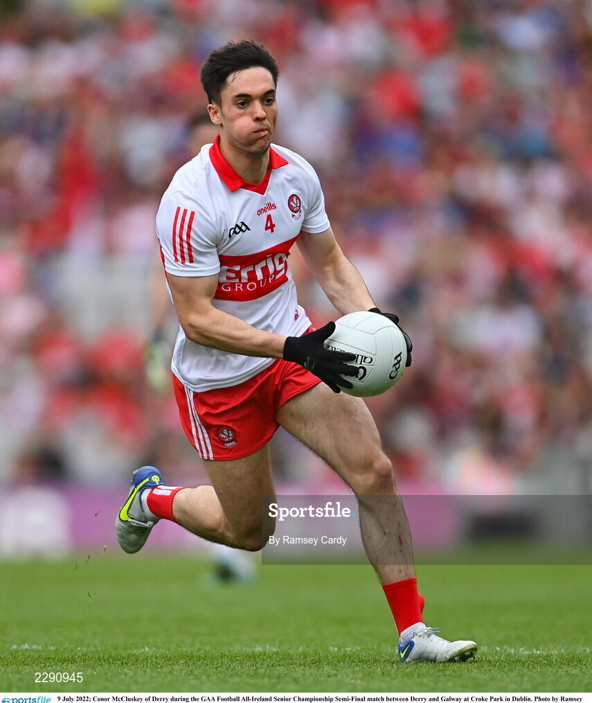 9 July 2022; Conor McCluskey of Derry during the GAA Football All-Ireland Senior Championship Semi-Final match between Derry and Galway at Croke Park in Dublin. Photo by Ramsey Cardy/Sportsfile
