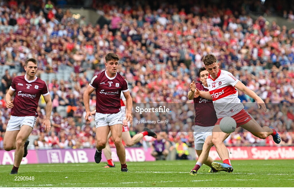9 July 2022; Shane McGuigan of Derry in action against Finnian Ó Laoi of Galway during the GAA Football All-Ireland Senior Championship Semi-Final match between Derry and Galway at Croke Park in Dublin. Photo by Ramsey Cardy/Sportsfile
