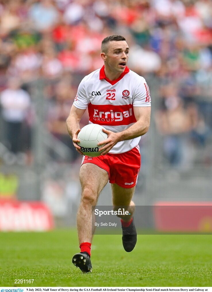 9 July 2022; Niall Toner of Derry during the GAA Football All-Ireland Senior Championship Semi-Final match between Derry and Galway at Croke Park in Dublin. Photo by Seb Daly/Sportsfile