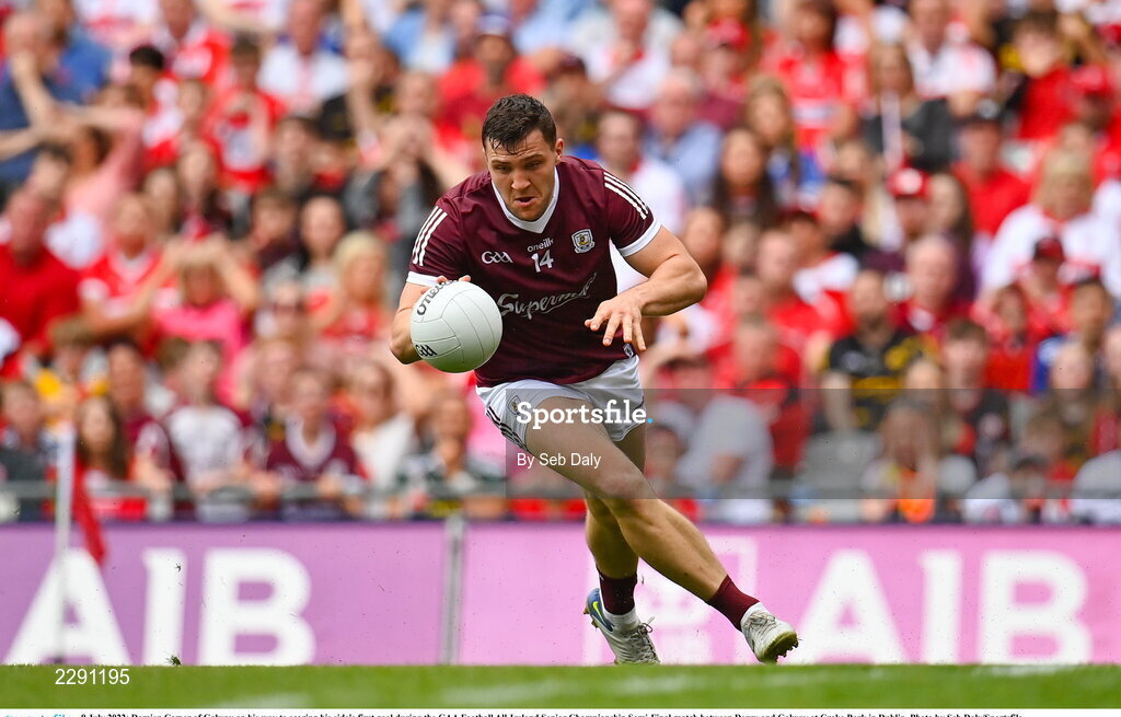 9 July 2022; Damien Comer of Galway on his way to scoring his side's first goal during the GAA Football All-Ireland Senior Championship Semi-Final match between Derry and Galway at Croke Park in Dublin. Photo by Seb Daly/Sportsfile