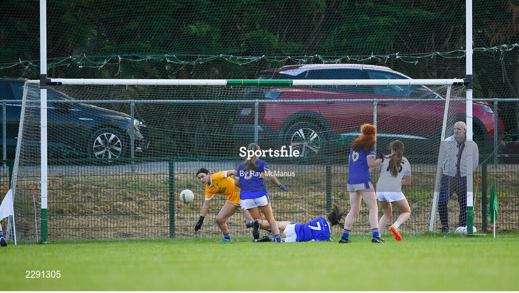 13 July 2022; Tara Rafferty of Kildare, 15, has a shot on goal saved by Tipperary goalkeeper Chloe Shorley during the 2022 All-Ireland U16 B Final between Kildare and Tipperary at Crettyard, Co. Laois. Photo by Ray McManus/Sportsfile