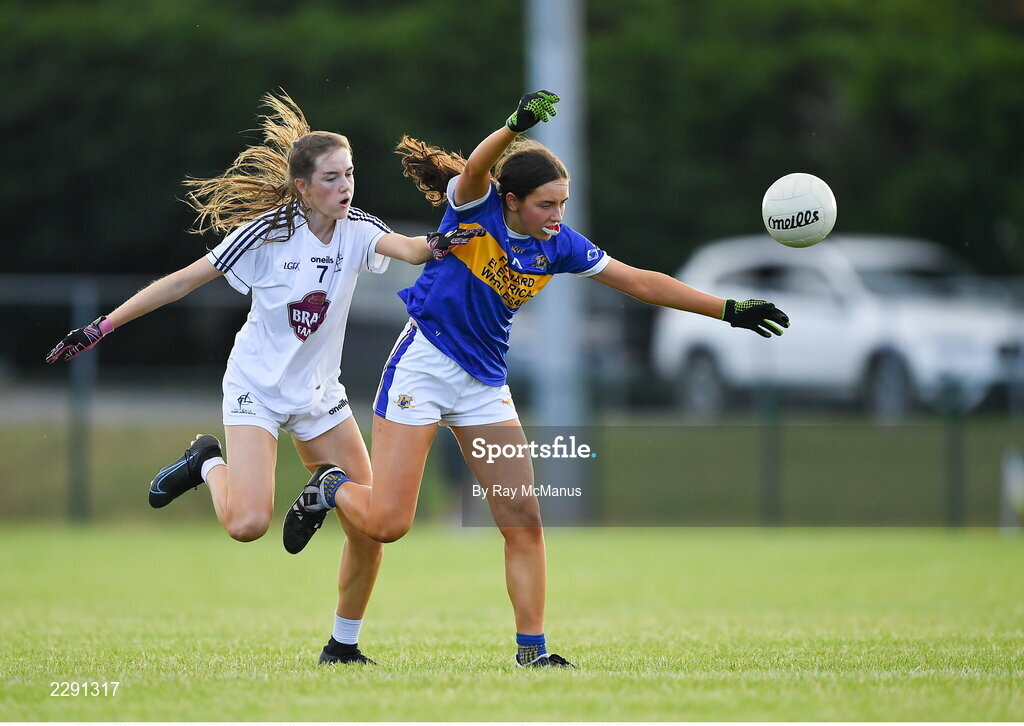 13 July 2022; Amy Reddan of Tipperary in action against Meabh McDonagh of Kildare during the 2022 All-Ireland U16 B Final between Kildare and Tipperary at Crettyard, Co. Laois. Photo by Ray McManus/Sportsfile