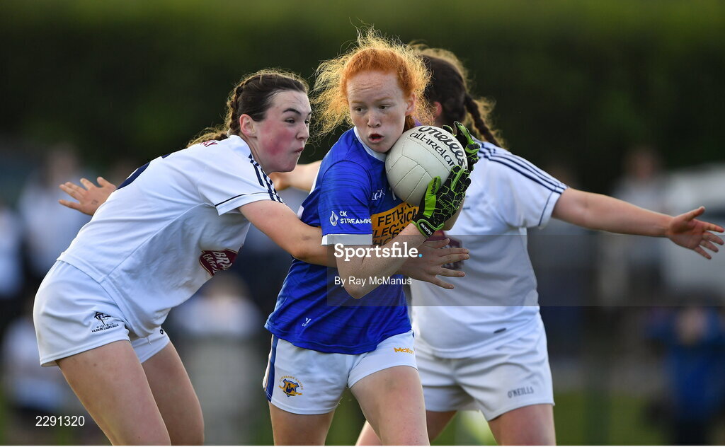13 July 2022; Ciara Shelly of Tipperary in action against Niamh Murphy of Kildare, left, and Zara Hurley during the 2022 All-Ireland U16 B Final between Kildare and Tipperary at Crettyard, Co. Laois. Photo by Ray McManus/Sportsfile