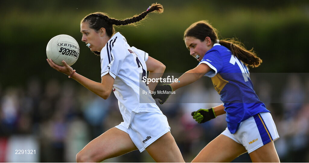 13 July 2022; Julie Brannigan of Kildare in action against Amy Reddan of Tipperary during the 2022 All-Ireland U16 B Final between Kildare and Tipperary at Crettyard, Co. Laois. Photo by Ray McManus/Sportsfile