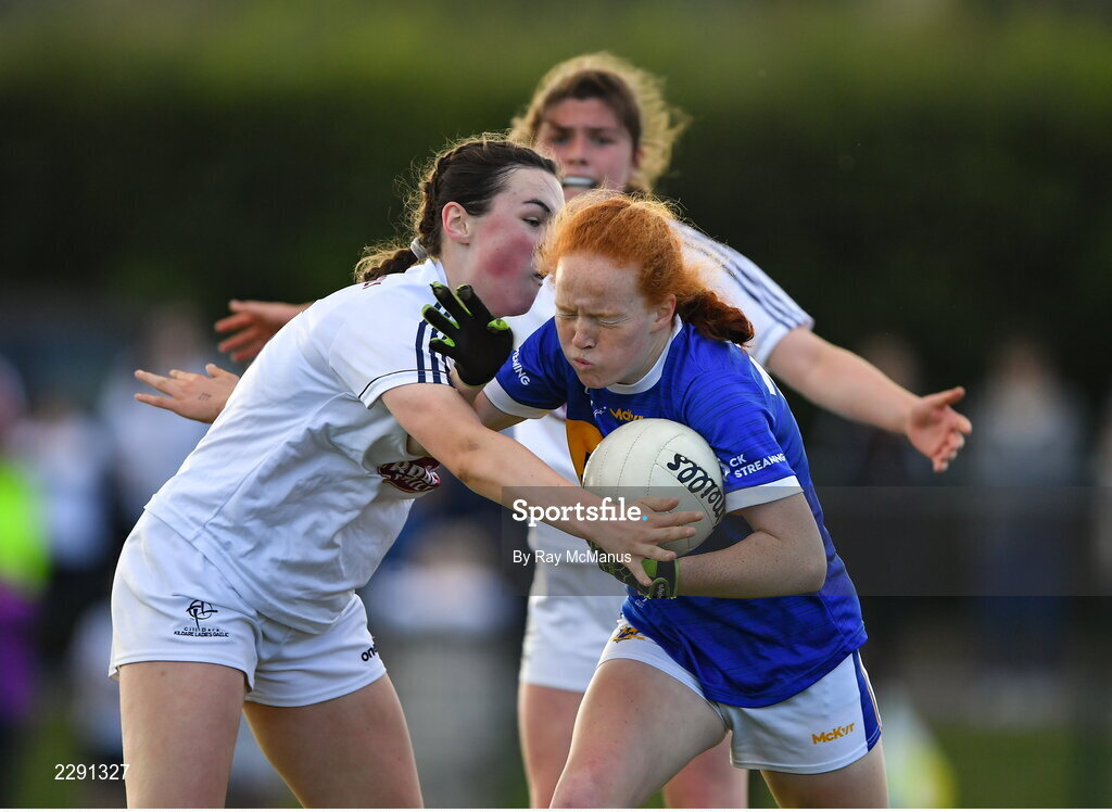 13 July 2022; Ciara Shelly of Tipperary in action against Niamh Murphy of Kildare, left, and Zara Hurley during the 2022 All-Ireland U16 B Final between Kildare and Tipperary at Crettyard, Co. Laois. Photo by Ray McManus/Sportsfile