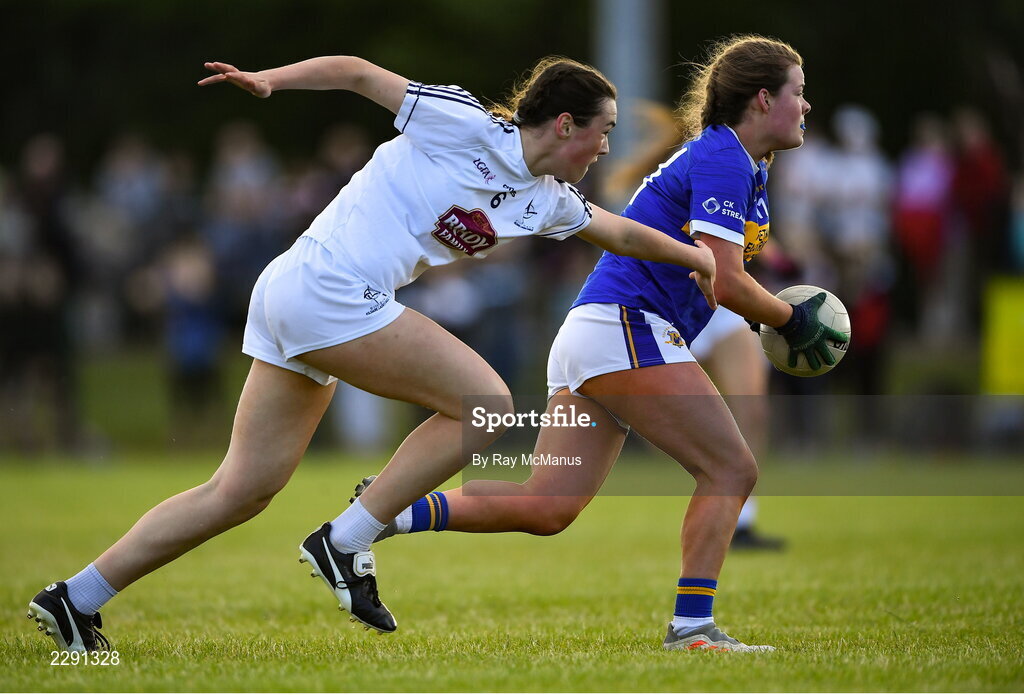 13 July 2022; Ciara O'Hora of Tipperary in action against Niamh Murphy of Kildare during the 2022 All-Ireland U16 B Final between Kildare and Tipperary at Crettyard, Co. Laois. Photo by Ray McManus/Sportsfile
