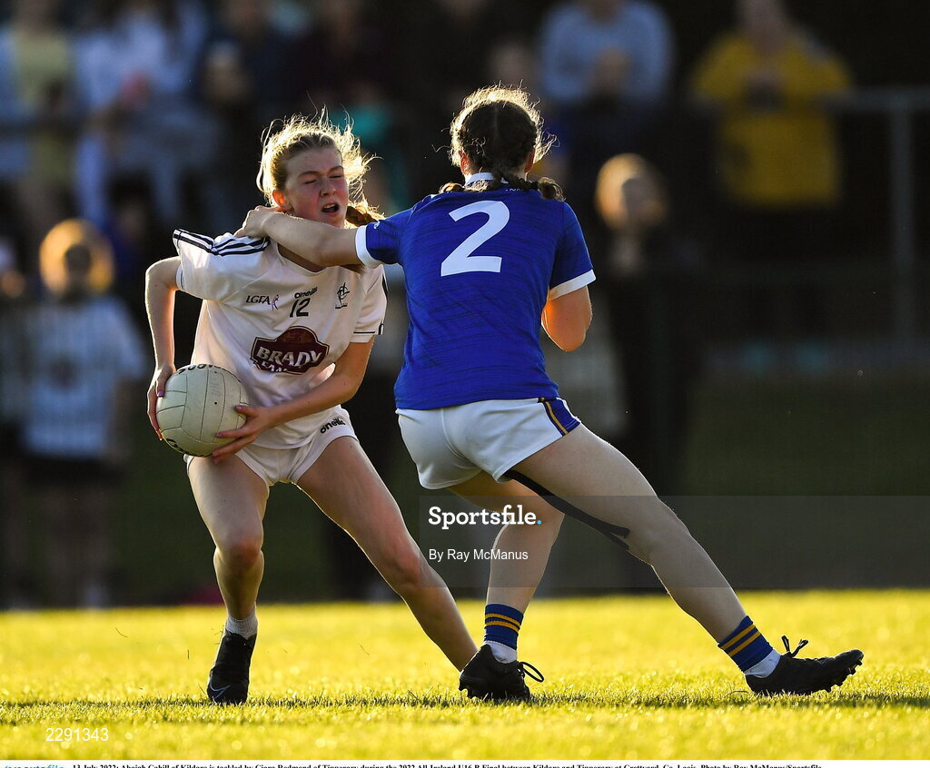 13 July 2022; Abaigh Cahill of Kildare is tackled by Ciara Redmond of Tipperary during the 2022 All-Ireland U16 B Final between Kildare and Tipperary at Crettyard, Co. Laois. Photo by Ray McManus/Sportsfile