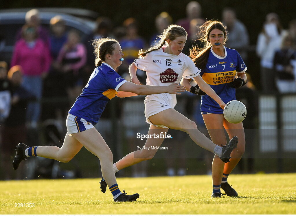 13 July 2022; Abaigh Cahill of Kildare is tackled by Ciara Redmond of Tipperary during the 2022 All-Ireland U16 B Final between Kildare and Tipperary at Crettyard, Co. Laois. Photo by Ray McManus/Sportsfile